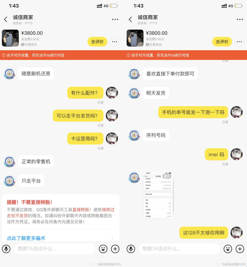 最開始他是在閑魚上面看到了一個 iPhone 13 Pro Max 128G,價格是 3800 元,機器外殼磨損啥的都o(jì)k,他看的非常中意,就聯(lián)系了一下這位 “ 誠信商家 ”。