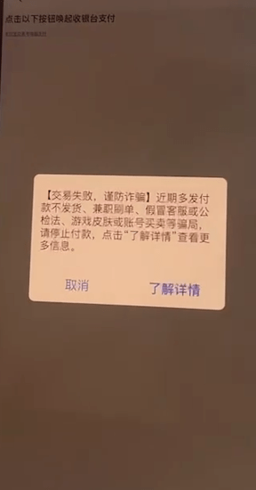 如果你現(xiàn)在直接點擊騙子的支付按鈕,系統(tǒng)會跳轉(zhuǎn)到這樣的一個防詐騙頁面。