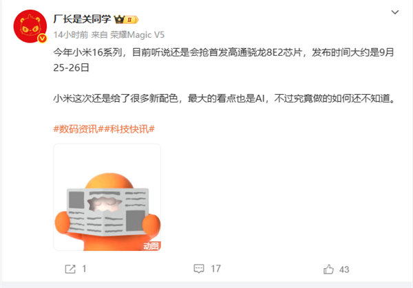 小米16系列旗艦亮相在即:搶發(fā)第二代驍龍8至尊版,預(yù)計(jì)推出五款機(jī)型快訊