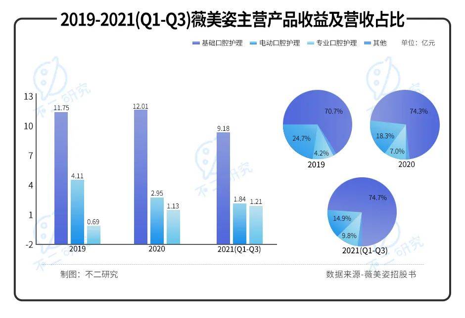 據招股書顯示,2019-2020年及2021前三季度,基礎口腔護理產品收益分別為11.75億元、12.01億元和9.18億元,占總營業收入的70.7%、74.3%和74.7%;電動口腔護理產品的收益分別為4.11億元、2.95億元和1.84億元,占總營業收入的24.7%、18.3%和14.9%;專業口腔護理產品的收益分別為0.69億元、1.13億元和1.21億元,占總營業收入的4.2%、7.0%和9.8%。
