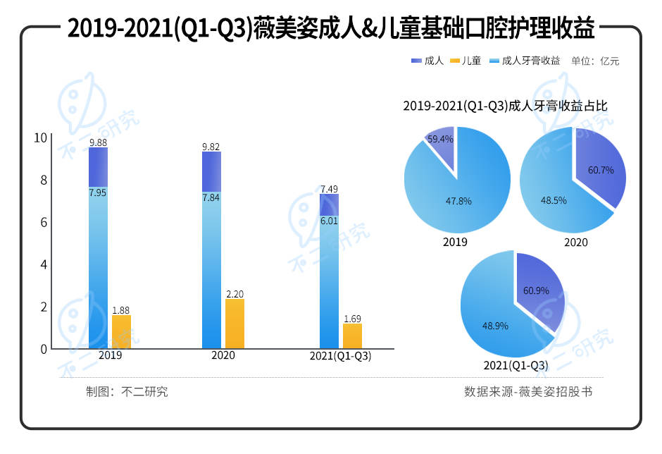 其中又以牙膏收益為主,2019-2020年及2021前三季度,牙膏收益分別為7.95億元、7.84億元和6.01億元,占總營業收入的47.8%、48.5%和48.9%。