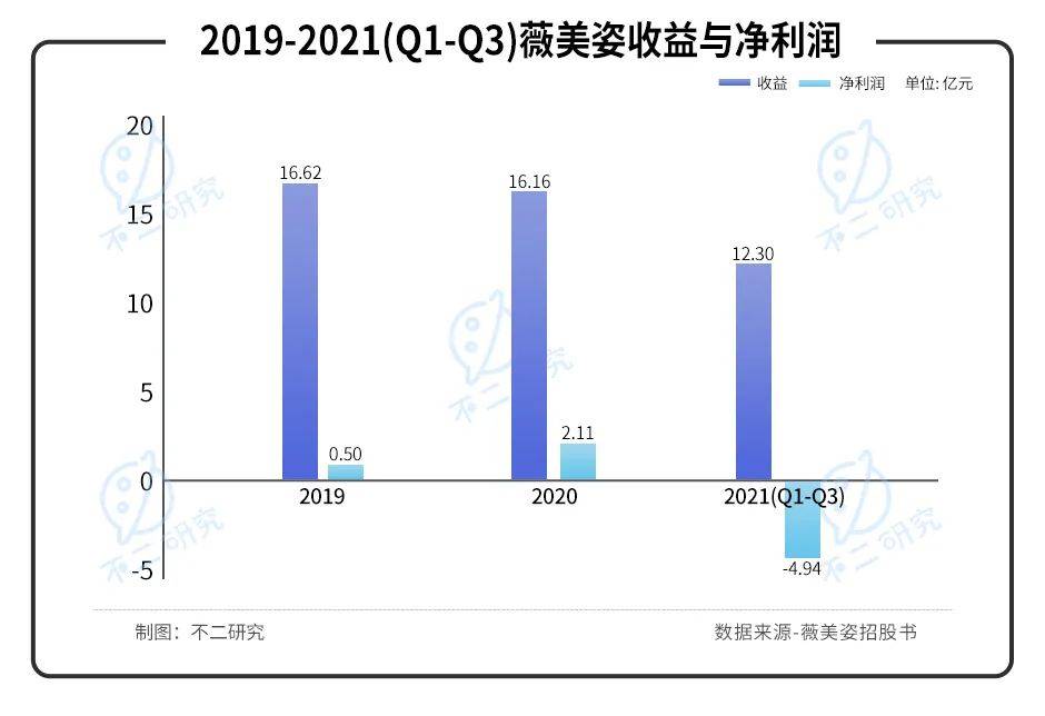 據招股書顯示,2019-2020年及2021前三季度,薇美姿收益分別為16.62億元、16.16億元和12.30億元;凈利潤分別為0.50億元、2.11億元和-4.94億元。