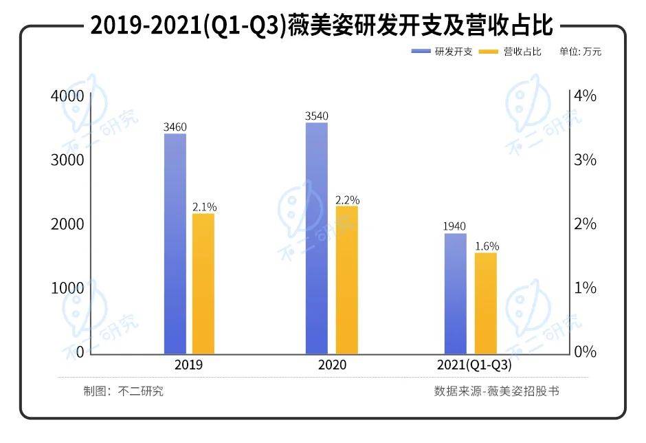 從研發收入上看,2019-2020年及2021前三季度,薇美姿的研發開支分別為3460萬元、3540萬元和1940萬元,占總營業收入的2.1%、2.2%和1.6%。