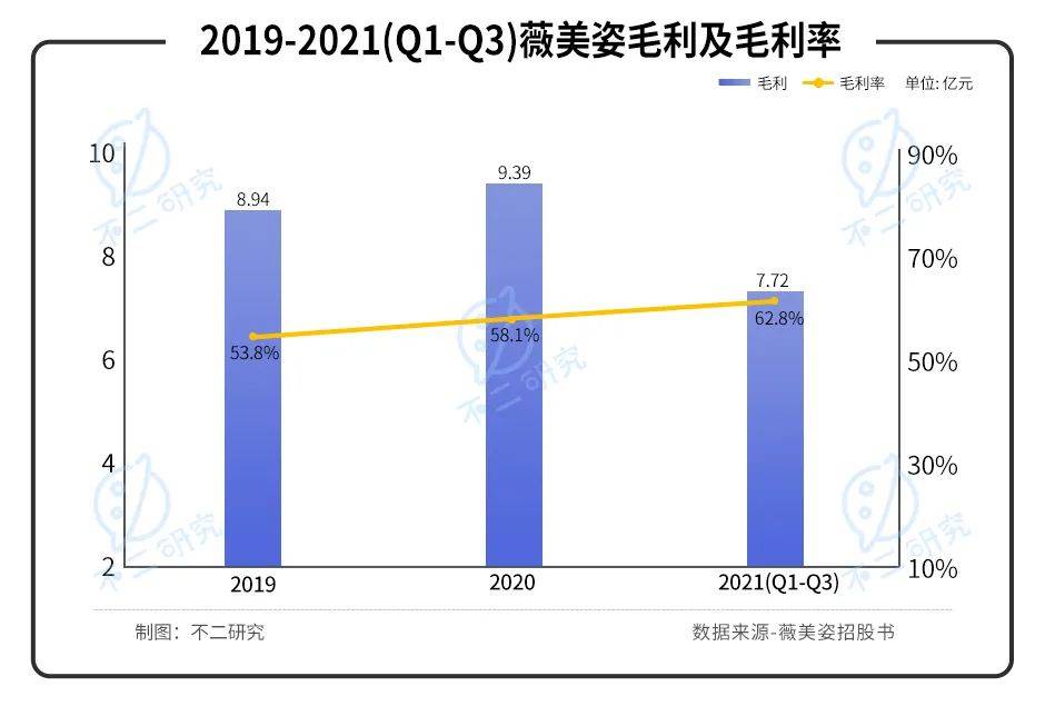 同期,薇美姿毛利分別為8.94億元、9.39億元和7.72億元;毛利率分別為53.8%、58.1%和62.8%。