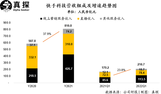 目前,快手的營收構(gòu)成主要是線上營銷服務(wù)、直播收入、其他服務(wù)收入三部分: