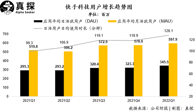 快手的“穩(wěn)”體現(xiàn)在用戶增長的同時維持了用戶時長的增加: