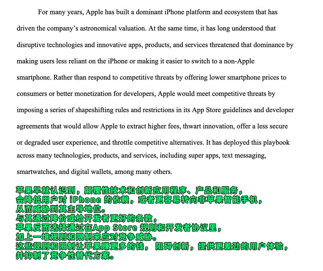 不過,這些點對我們中國人來說,可能感知還不是很強烈。但是,訴訟書里的另一點,你一定深有同感,那就是封閉的蘋果生態。
