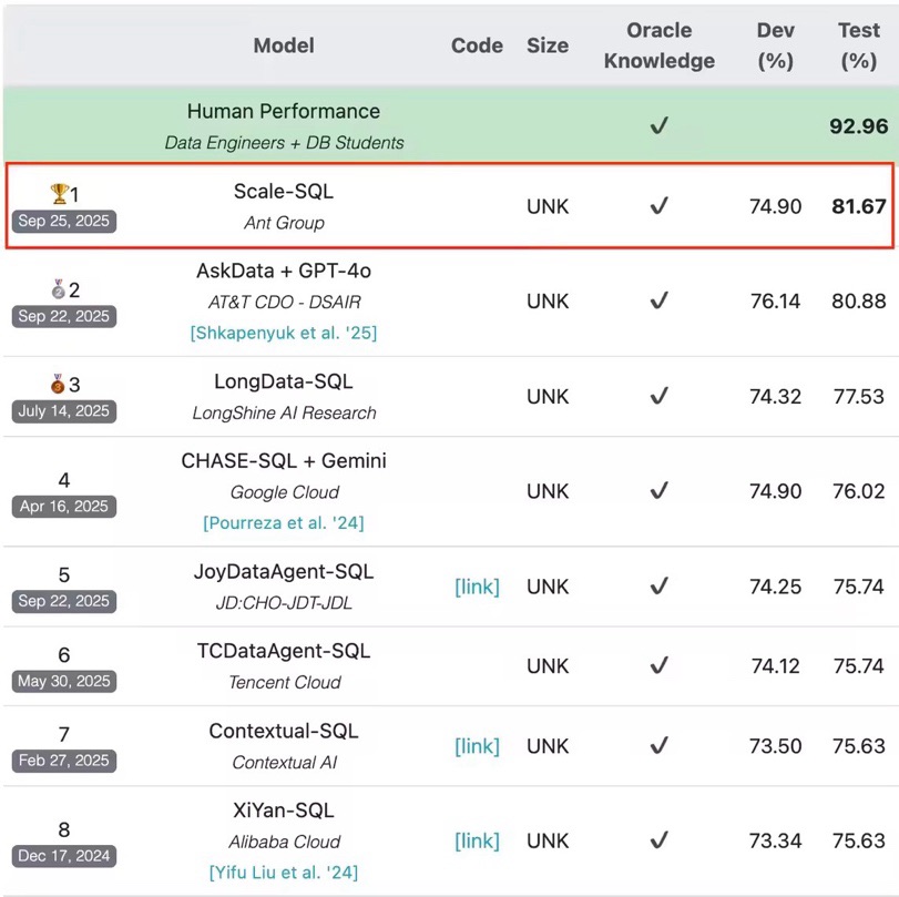 【TechWeb】9月26日消息,據全球權威評測基準BIRD-Bech官網,螞蟻數科的數據分析智能體Agentar-SQL超越AT&T(美國電話電報公司)、谷歌云、騰訊云、阿里云等諸多國內外廠商,位居全球第一。這也是中國公司在該榜單上取得的最高成績。
