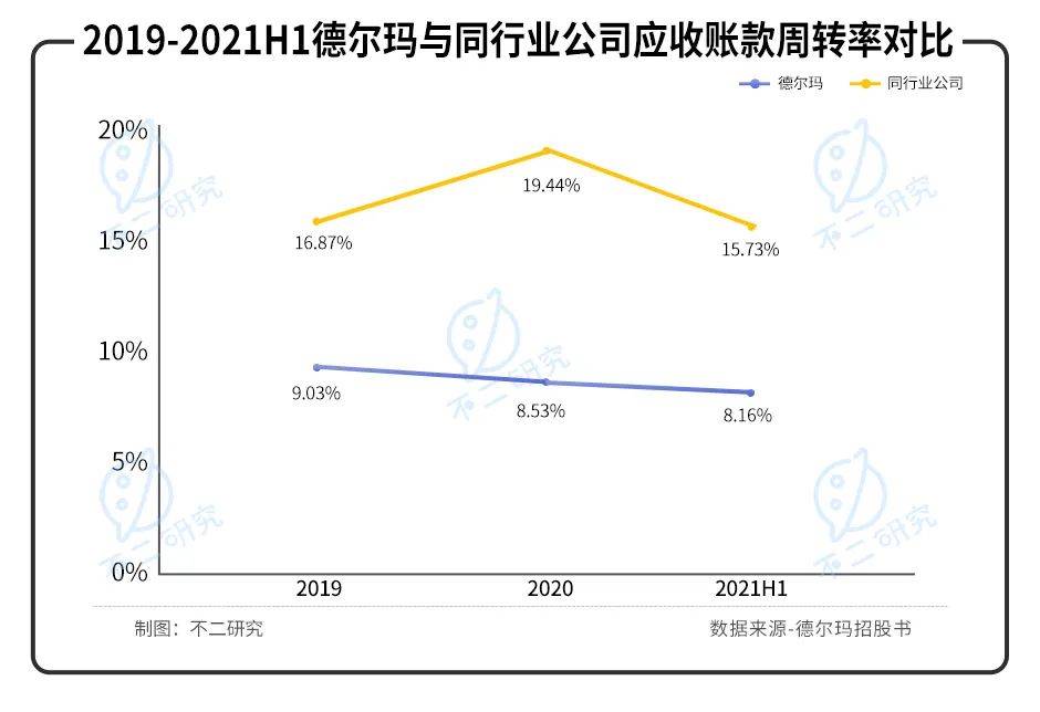 但是,「不二研究」認(rèn)為,在ODM模式下的回款周期增長(zhǎng)對(duì)其現(xiàn)金流影響以不可忽視。據(jù)德?tīng)柆斦泄蓵?shū)顯示,德?tīng)柆數(shù)膽?yīng)收賬款周轉(zhuǎn)率明顯低于行業(yè)均值且呈明顯下降趨勢(shì),這也是米家ODM模式為其帶來(lái)的弊病。
