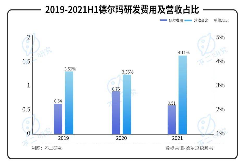 據(jù)德?tīng)柆斦泄蓵?shū)顯示,其研發(fā)費(fèi)用率從2019年-2021年上半年分別為3.59%,3.36%,4.11%,而同期的銷售費(fèi)用率卻達(dá)16.92%,15.41%,15.11%,銷售費(fèi)用率顯著高于研發(fā)費(fèi)用率。