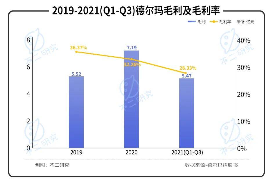在營(yíng)收穩(wěn)定增長(zhǎng)的情況下,德?tīng)柆數(shù)臍w母凈利潤(rùn)增速呈斷崖式下跌。顯然,其盈利能力出現(xiàn)了問(wèn)題,據(jù)德?tīng)柆斦泄蓵?shū)顯示,2019年-2021年前三季度其毛利分別為5.52億元,7.19億元,5.47億元,對(duì)應(yīng)毛利率分別為36.37%,32.26%,28.33%。