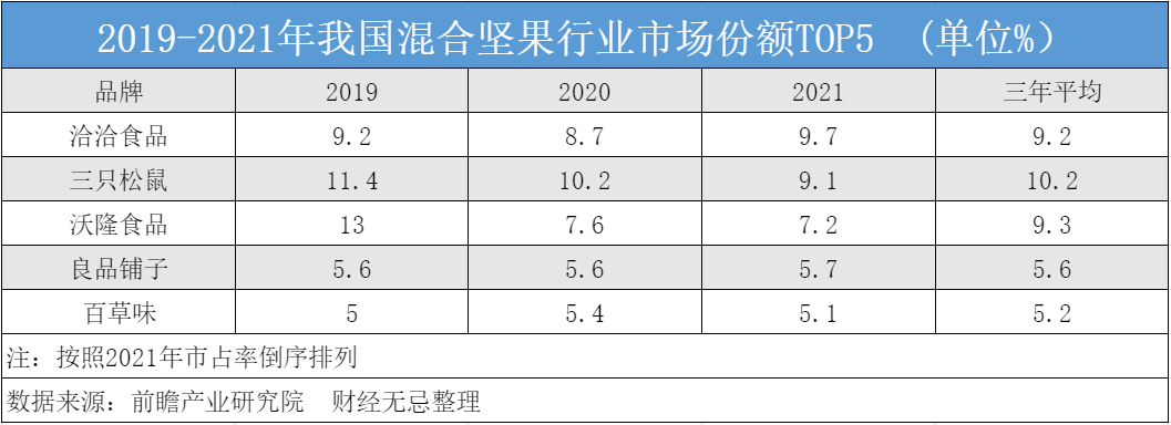 根據前瞻產業研究院的一組調研數據顯示,2019年以前,沃隆在混合堅果行業中市場份額最高,2019年達到13%,位居行業第一;2020年市場份額為7.6%,行業排名第三;2021年市場份額為7.2%,行業排名第三。