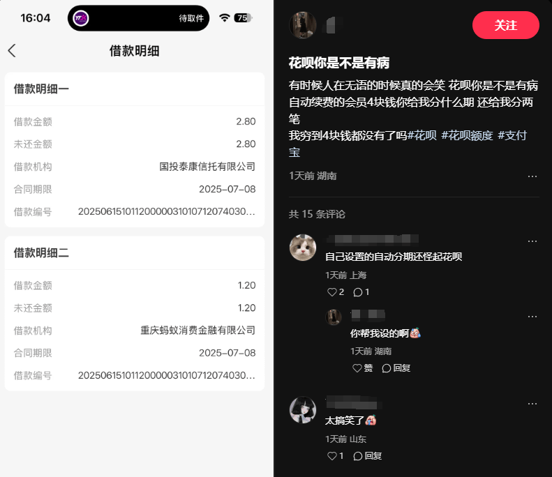 從2分錢到4塊錢,甚至更微小的金額,花唄竟然將這些小額訂單拆分給了兩家不同的信貸公司。這種看似荒誕的行為,實則暴露了花唄在運營過程中的不透明與不合理。消費者在不知情的情況下,被卷入了復雜的借貸關系中,不僅增加了不必要的心理負擔,也引發了對其個人隱私與財務安全的擔憂。