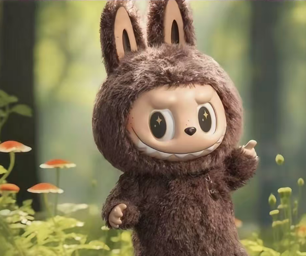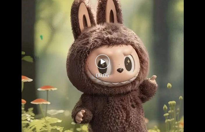 輸入視頻描述:森林里,陽光透過樹葉灑落,鏡頭緩緩移動,labubu旋轉跳躍。
