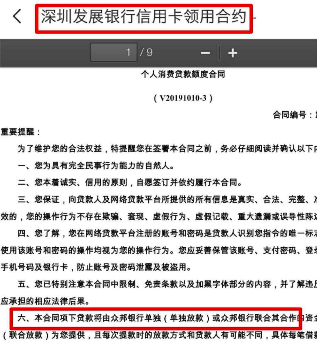 還有《個(gè)人消費(fèi)貸款合同》,合同是借款人與眾邦銀行簽約,但合同頁面卻顯示深圳發(fā)展銀行信用卡領(lǐng)用合約,不知道是套用合同還是工作失誤。