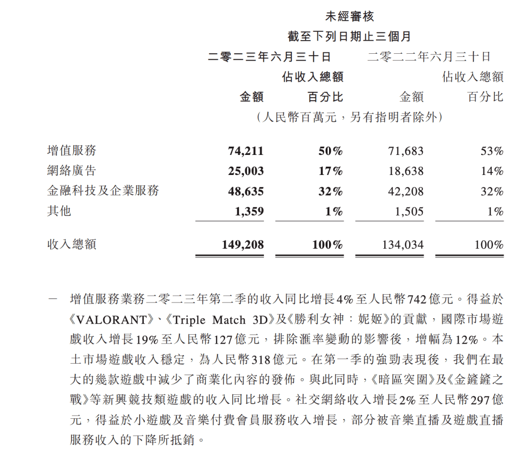 財報顯示,以游戲為主的增值服務在總營收中的占比從上年同期的53%降至50%,二季度營收同比增長4%至742.11億元。騰訊二季度本土市場游戲收入為318億元,與去年同期持平,較上一季度環比下降了9.5%,《暗區突圍》及《金鏟鏟之戰》等新興競技類游戲的收入同比增長。
