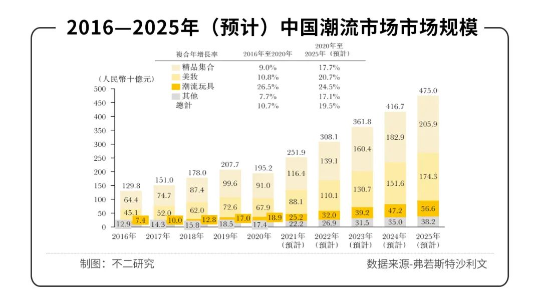 潮流零售擁有千億級別的廣闊市場。根據(jù)弗若斯特沙利文,2020年潮流零售市場規(guī)模為1952億元,預(yù)計(jì)2025年市場規(guī)模將達(dá)到4750億元,復(fù)合年增長率高達(dá)19.5%;而同期中國整體零售市場規(guī)模年復(fù)合增速分別僅為5.9%。