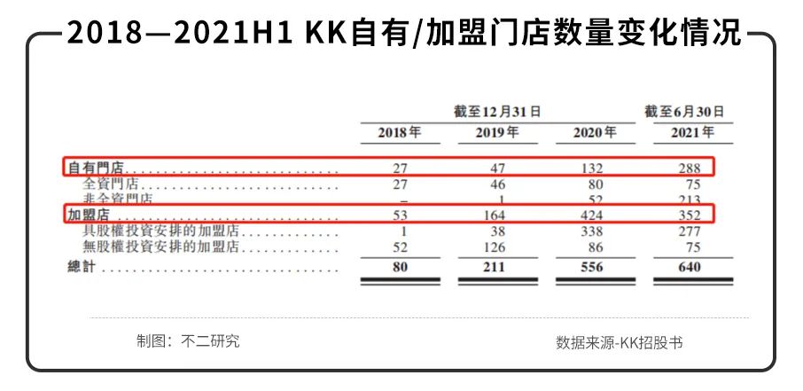 KK的門店包括加盟店與自營店。據(jù)招股書,截至6月KK旗下門店共有640家,其中自營店有288家,加盟店有352家,以加盟店為主。