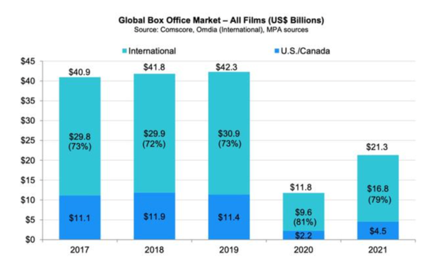 2022年3月,美國電影協會官網發布2021年全球娛樂數據。2021年的全球票房收入從2020年的118億美元增長到213億美元,年增長率達80.5%。但盡管如此,也僅僅是疫情前2019年423億美元收入的一半左右。