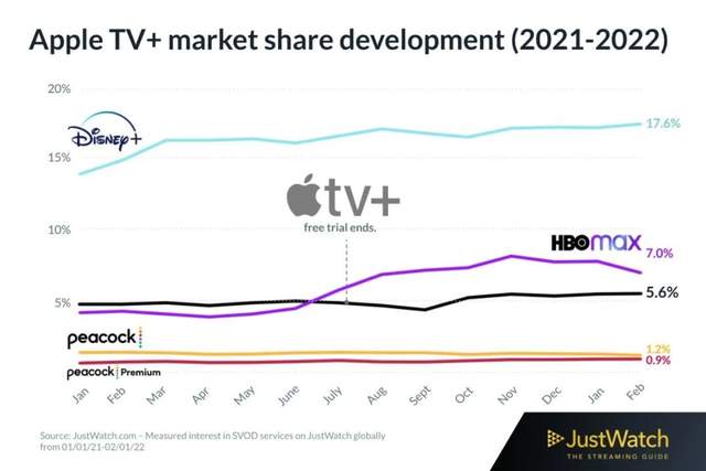 2022 年 2 月,Apple TV + 的全球市場份額為5.6%——這仍然遠遠落后于Disney + 和Netflix這幾個大的競爭對手,但正在接近 HBO Max(JustWatch 估計,HBO Max 占全球流媒體市場份額的7%)。