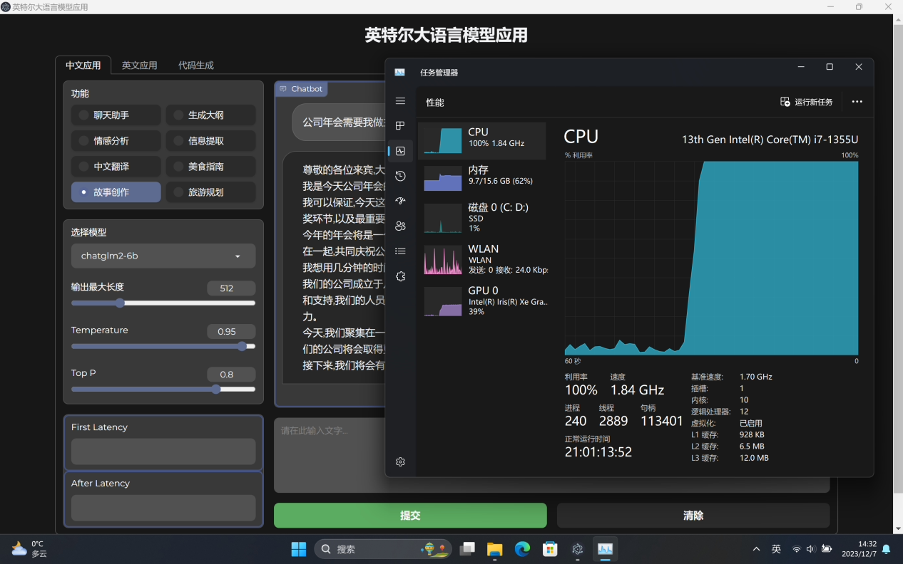 在大語言模型寫文案的時候,小編看了一下華碩破曉 Air 性能資源的調度情況,13 代酷睿 i7-1355U 處理器占用率達到了 100%,內存占用達到了 9.7GB(62%),Xe 核顯占用也達到了 39%??磥磉@個運算過程確實是在本地進行的。在英特爾不斷的優化和 13 代酷睿處理器算力的提升下,確實能夠在輕薄本上實現 AIGC 的落地。