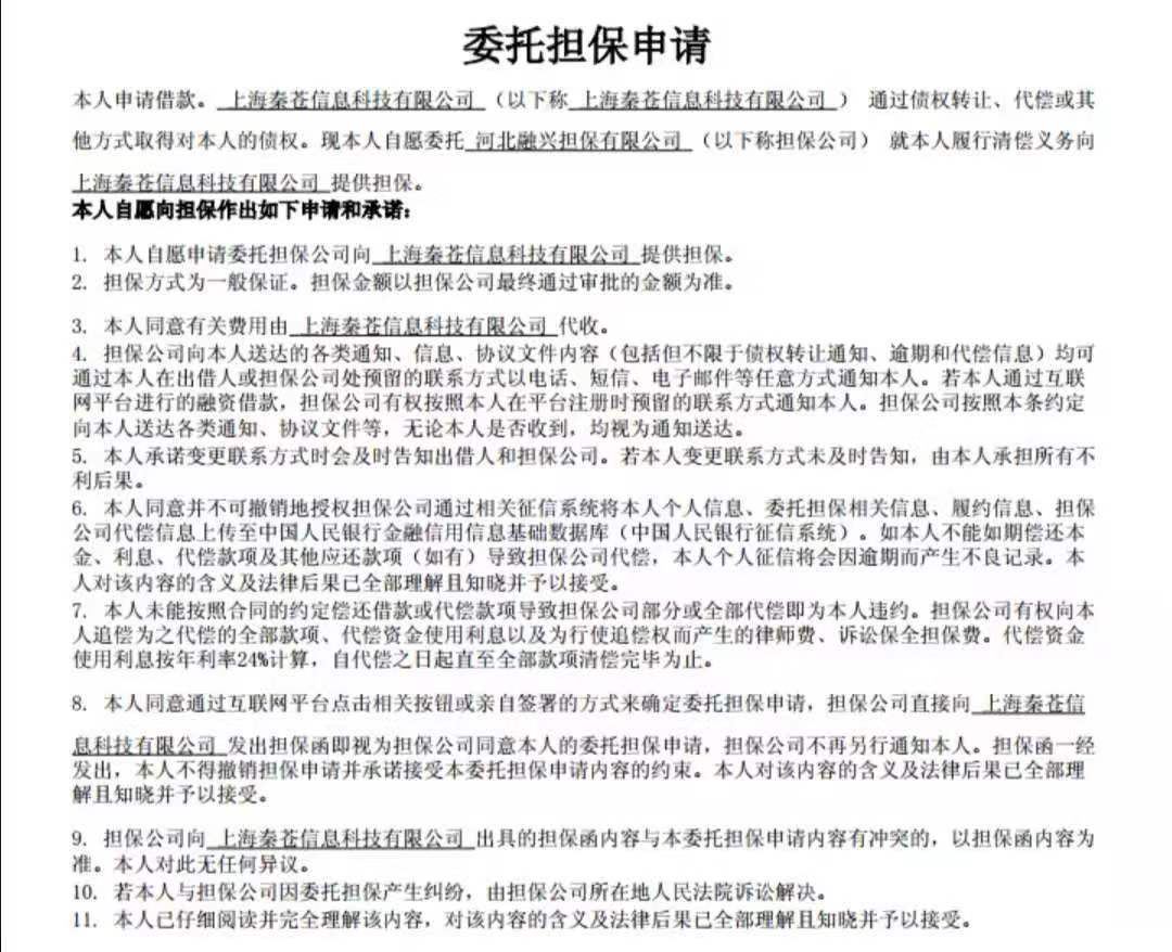 據(jù)新金融看點(diǎn)所獲的《委托擔(dān)保申請(qǐng)》顯示,秦蒼科技通過債權(quán)轉(zhuǎn)讓、代償或其他方式取得對(duì)借款人債權(quán)。借款人自愿委托河北融興擔(dān)保有限公司(下稱“河北融興”)就借款人履行清償義務(wù)向秦蒼科技提供擔(dān)保。