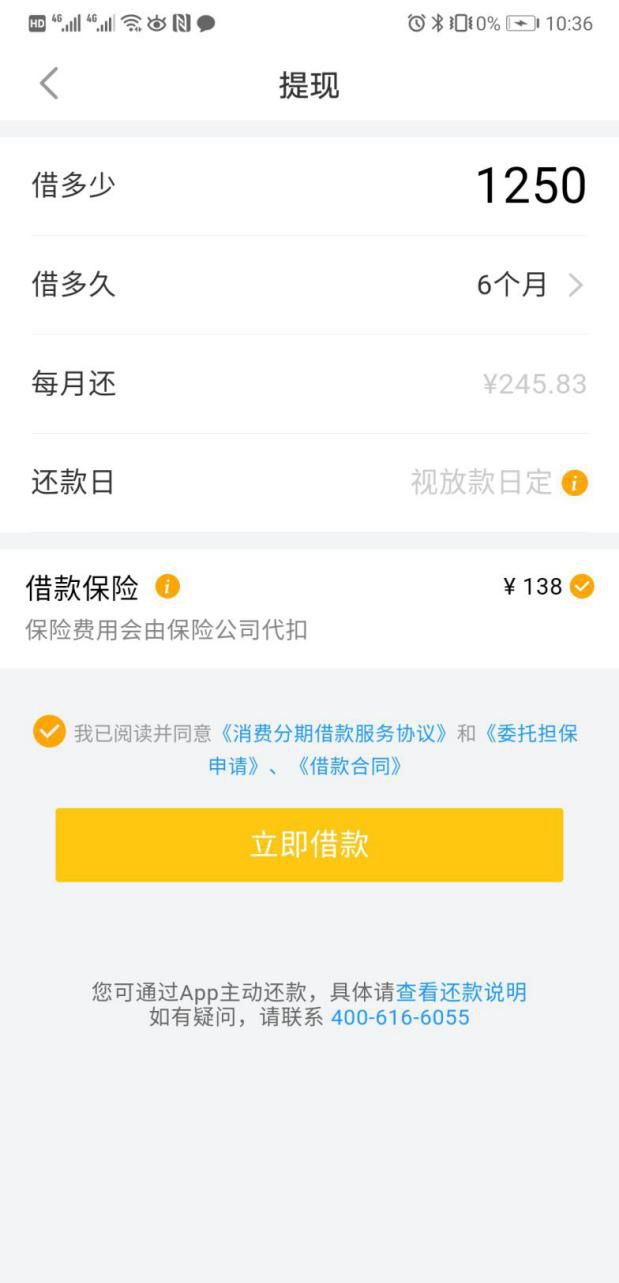提現(xiàn)頁面顯示,該保險(xiǎn)費(fèi)用是由保險(xiǎn)公司代扣。按照借款1250元,分期6個(gè)月,最終要被扣除138元保險(xiǎn)費(fèi)。在借款6個(gè)月中,每期償還245.83元,共計(jì)1474.98元。扣除了138元后,實(shí)際到賬1112元,新金融看點(diǎn)經(jīng)過計(jì)算,最終的年化利息達(dá)到65.2%。