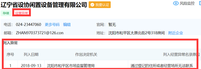 據公開信息顯示,遼寧省設協閑置設備管理有限公司從2018年9月失聯至今。