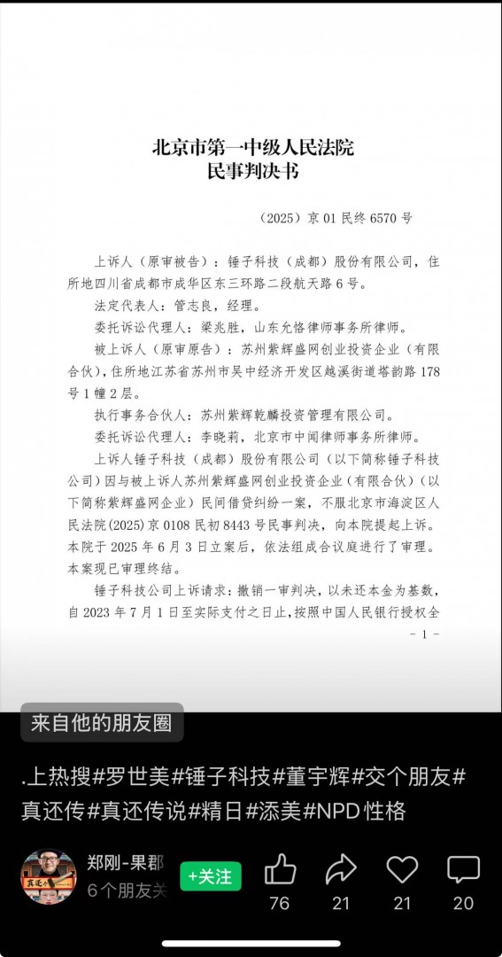 【TechWeb】6月26日消息,羅永浩與紫輝創投CEO鄭剛“1500萬借款”糾紛二審判決落地。昨日鄭剛在視頻號上放出了判決書全文。