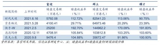 由于暗盤交易屬場(chǎng)外交易,不是通過交易所交易系統(tǒng),而是通過券商內(nèi)部系統(tǒng)報(bào)價(jià)撮合交易,因此流動(dòng)性和收?qǐng)?bào)價(jià)格是投資者選擇券商打新的重要考量。從流動(dòng)性來(lái)看,輝力是最早擁有自研暗盤的老牌券商,吸引了很多券商接入其暗盤交易系統(tǒng),富途在交易額方面與輝力尚有差距,但高于耀才和一通。從暗盤收益率(暗盤收盤價(jià)/招股價(jià))來(lái)看,富途也具有一定優(yōu)勢(shì)。