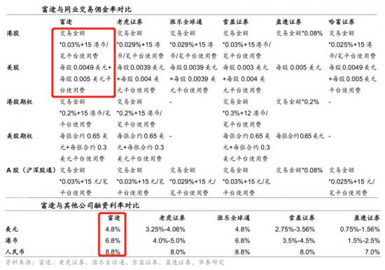 相對(duì)于其它互聯(lián)網(wǎng)券商,富途的傭金費(fèi)率和融資利率都處于高位,而且在香港零售市場(chǎng)的交易市占率不斷提升,縮小了與傳統(tǒng)跨國(guó)券商巨頭的差距。