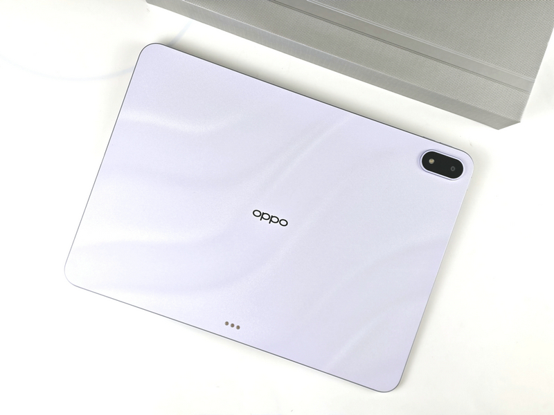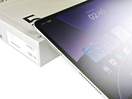 OPPO Pad 5的背部設計是其外觀的一大亮點。尤其是筆者手中全新的幸運紫配色,采用了流光幻影工藝,在不同的光線和角度下,能夠呈現出絲綢般的流動感,仿佛紫色的光芒在金屬背板上流淌,極具時尚感和視覺沖擊力。這種獨特的工藝不僅讓平板電腦的外觀更加引人注目,還賦予了它一種獨特的藝術氣息。