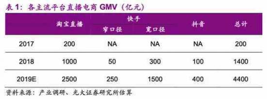 據(jù)光大證券數(shù)據(jù)顯示,2019年直播電商總規(guī)模預(yù)計(jì)4400億,其中淘寶占2500億,快手寬口徑統(tǒng)計(jì)占1500億,而抖音直播僅占400億。三強(qiáng)之中抖音最末。