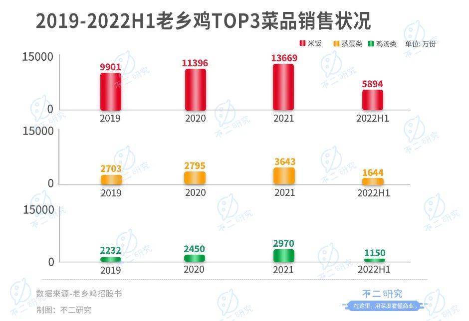 從產品構成來看,老鄉雞以肥西老母雞湯產品為特色,但其最為暢銷的產品竟是米飯。2022上半年,老鄉雞銷售量Top3的菜品分別是米飯、蒸蛋和雞湯,分別售出5894萬、1644萬和1150萬。