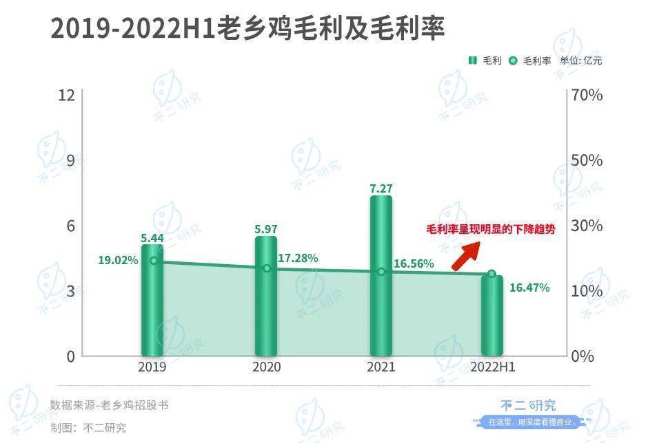 同時,毛利率也顯示出老鄉雞的短板。根據招股書,2019-2022上半年,老鄉雞整體毛利率分別為19.02%、17.28%、16.56%和16.47%,呈現明顯的下降趨勢。對此,老鄉雞在招股書在解釋稱是受原材料成本上升、人工成本上升等因素影響。