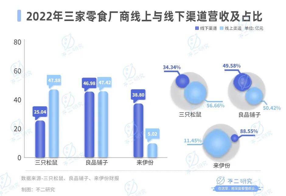 「不二研究」認為,從實際營收數(shù)據(jù)來看,三只松鼠倚重線上渠道;良品鋪子采取“兩條腿走路”策略,在線上和線下均有所布局;來伊份則主要依賴線下渠道。