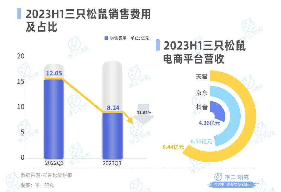 具體來說,三只松鼠增利不增收主要原因在于,其平臺及推廣費用減少,同時在傳統(tǒng)電商平臺上,營收繼續(xù)下滑。2023年三季報數(shù)據(jù)顯示,三只松鼠的銷售費用由去年同期的12.05億下降至8.24億,同比減少31.62%;今年上半年,其天貓系收入8.44億元,同比減少29.49%;京東系收入6.59億元,同比減少41.11%。