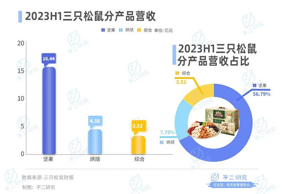 在品牌的IP化中,三只小松鼠分別代表堅果、花茶、干果類產(chǎn)品。其2023年半年報顯示,混合堅果貢獻了56.79%的銷售額,同比下降30.50%。