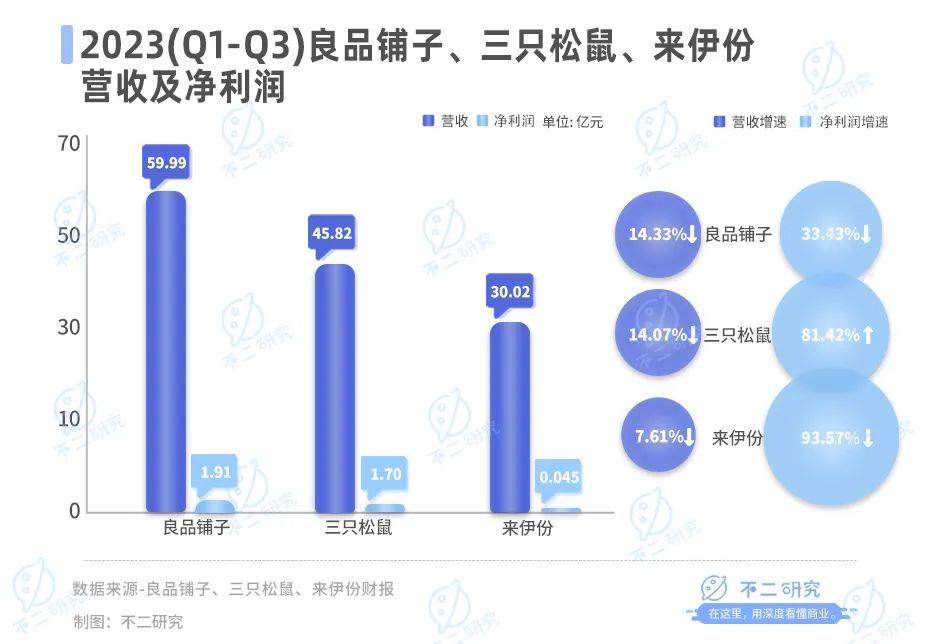 具體來看,2023年三季報數(shù)據(jù)顯示,良品鋪子營收59.99億元,同比減少14.33%;三只松鼠實現(xiàn)營收45.82億元,同比減少14.07%;來伊份營收30.02億元,同比減少7.61%。
