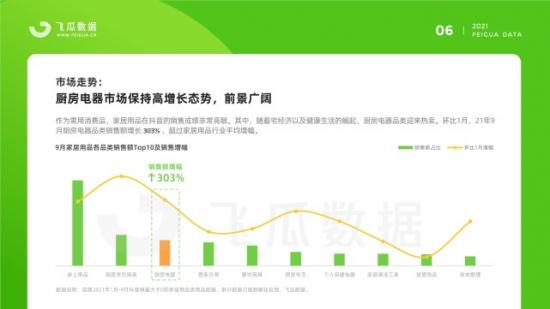 據飛瓜數據,廚房電器在抖音短視頻、直播中銷售成績就非常亮眼。今年9月,廚房電器品類銷售額增長303%,超過了家居用品行業的平均增幅。