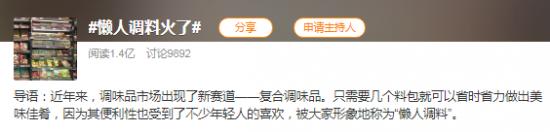 近日,一則“懶人調料火了”的話題在微博掀起一陣風暴,閱讀超1.4億,討論9892次,火熱程度不亞于娛樂圈的風云大戰。