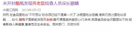 更恐怖的是,某品牌的醋在未開封的醋瓶中被發現有死老鼠,惡心至極。