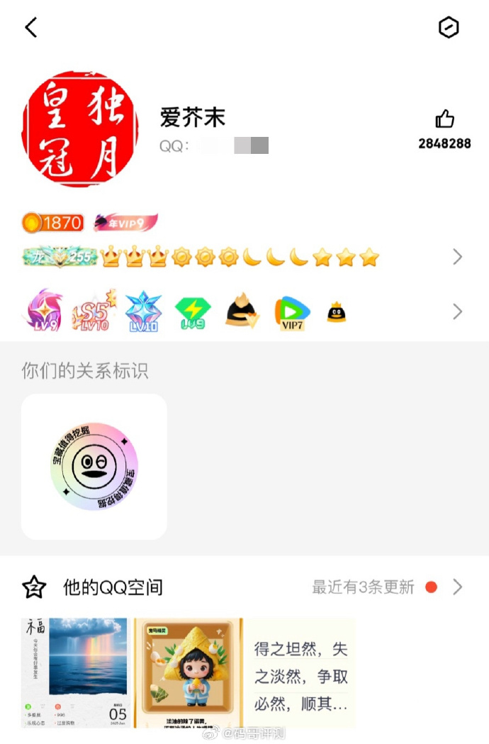 據報道,全球首個滿級QQ賬號即將誕生,一位昵稱為“愛芥末”的QQ用戶已在今年5月達到255級,擁有3 頂皇冠、3個太陽、3盞月亮、3個星星。