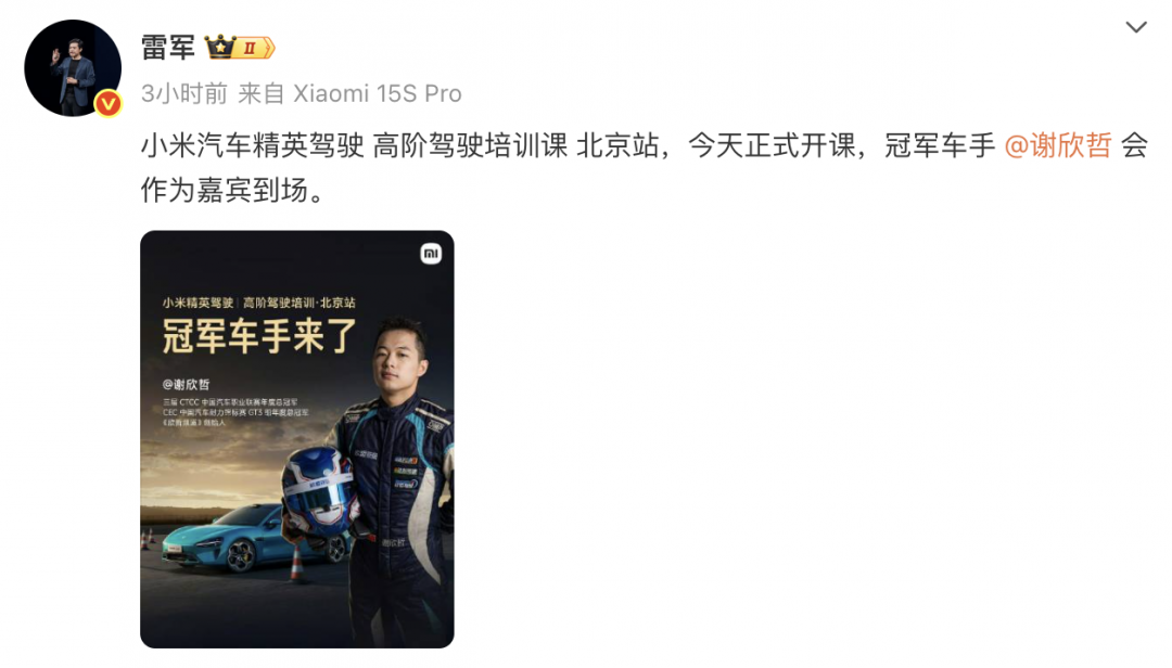 小米創辦人,董事長兼CEO雷軍在微博表示,小米汽車精英駕駛高階駕駛培訓課北京站于今天正式開課,冠軍車手謝欣哲將會作為嘉賓到場。
