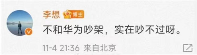 網友想把李想引入戰局,理想汽車CEO李想退避三舍。沒想到吃過虧的李想表示:不和華為吵架,實在吵不過呀。要知道,此前把AEB成績拿出來曬,印證車型智駕能力的,理想汽車是比較積極的,可以看出這或許也是一種變相的捧殺。