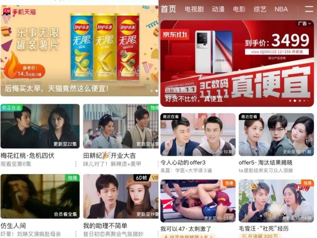 進(jìn)入雙十一周期,打開長(zhǎng)視頻平臺(tái)最常見的是印有雙十一標(biāo)識(shí)的廣告,頻率之高、數(shù)量之多,引人感嘆。開屏、banner,甚至正片列表、選集下方的廣告位 ,都有關(guān)于雙十一的廣告,從品牌到平臺(tái)都是可能出現(xiàn)的內(nèi)容。電商平臺(tái)和品牌方在長(zhǎng)視頻平臺(tái)的廣告投放,不僅僅滿足于站內(nèi)資源位,劇綜等內(nèi)容廣告植入,也在為雙十一預(yù)熱和定制著內(nèi)容。