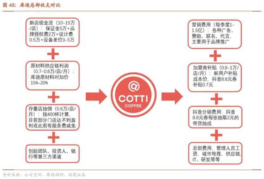 根據“產業科技”測算,開一家庫迪門店的起始費用在40萬元上下,包括5萬元保證金,基礎裝修、硬件設備等22.5-51萬元,以及租金、人力、水電等成本。目前庫迪多數門店的日銷量在200-300杯之間,按日單量300杯測算,月毛利在27000元,庫迪每家門店員工至少在4名,有的甚至達到6名以上,那么人員費用按5000每月計算,則至少在2萬元,每月房租1萬,水電3000,扣除這些,聯營商大概率只能賠本賺吆喝。
