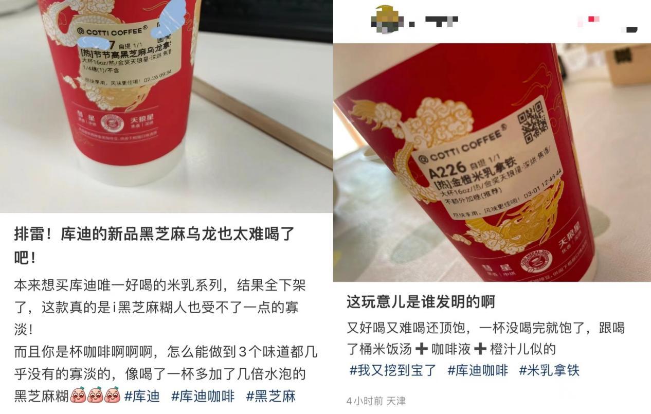 另一方面,還有一部分消費者的抱怨主要集中在庫迪的產品上。部分沖著9.9去的消費者,在嘗試了庫迪的產品后,在社交媒體上抱怨道“怎么做到3個味道都幾乎沒有的寡淡”“像喝了一杯多加了幾倍水泡的黑芝麻糊”“像喝了桶米飯湯+咖啡液+橙汁”......