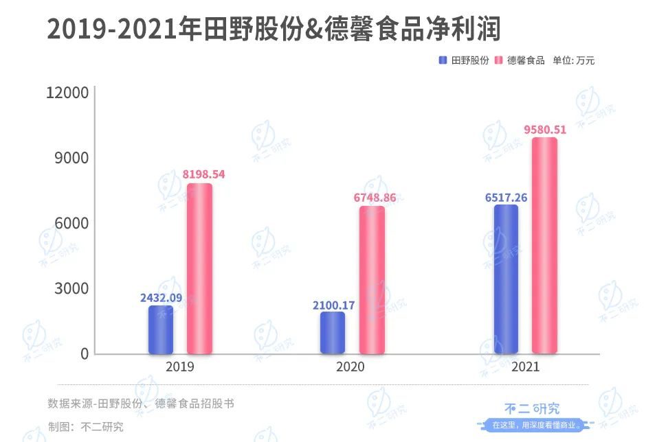 從凈利潤來看,二者逐漸走出疫情陰霾,正經歷高速發展。招股書顯示,2019-2021年,田野股份凈利潤分別為2432.09萬元、2100.17萬元及6517.76萬元,其中2021年凈利潤增長率高達210.34%;德馨食品凈利潤分別為8198.54萬元、6748.86萬元和9580.51萬元,其中2021年凈利潤增長率為38.93%。