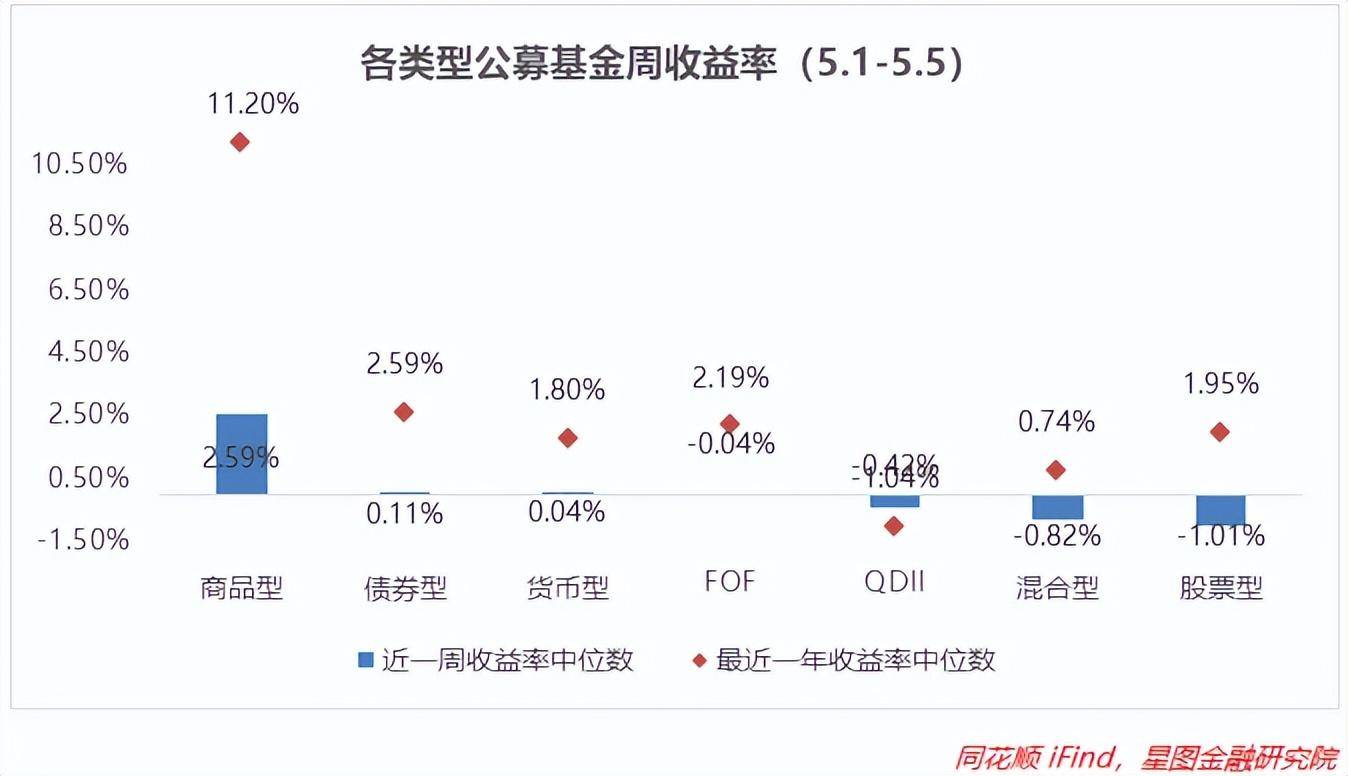上周基金收益率中商品型基金周收益率中樞最高,接近2.6%,環比+2.4pct,受金價創下歷史新高收益率大漲,但是原油依舊在調整。其余類型基金在跟蹤指數均回調的情況下表現并不好,FOF型、QDII型周收益率跌幅勉強維持在0.5%以內;股票型領跌,跌超1%。不過商品型基金年收益率中樞大幅領漲,超過11%,是所有基金類型中年收益率中樞唯一改善的,環比+1.86pct;除此之外的基金年收益率中樞都在轉差。債基、貨基收益率中樞在0%上下浮動。